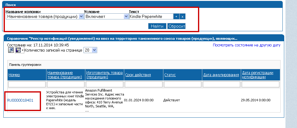 В УСЛОВИЯ выбираем «Включает»В ТЕКСТ в качестве наименования указываем : Kindle Paperwhite. В базе данных номер нотификации выглядит следующим образом: RU0000018401 (рис.1)