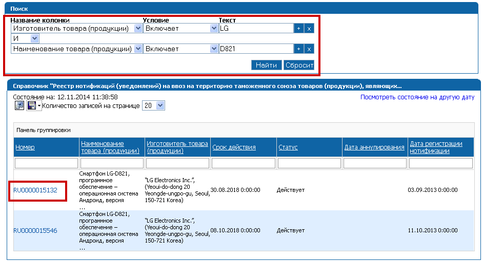Что касается Google Nexus 5 то компания производитель является LG, следовательно в поиске необходимо указывать в Фильтре №1 вместо Google Nexus 5 производителя LG ,а в фильтре №2 указывать модель D821 (рис.2),так как в России работает только модель D821 и производитель оформил нотификацию только на нее . В базе данных номер нотификации выглядит следующим образом: RU0000015132