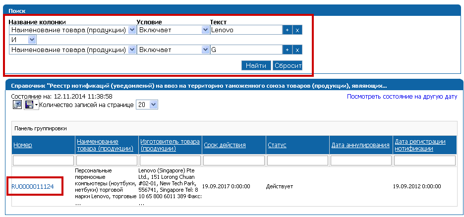 Пример, ноутбук Lenovo IdeaPad G5070 в данном случае поиск по модели G5070 нечего не даст. Чтобы найти общую категорию, необходимо удалить в модели последний цифро-буквенный код. (рис.3) В базе данных нотификации выглядит следующим образом: RU0000011124 Серия G*, здесь индекс [ * ] обозначает комбинацию любых буквенно-цифровых символов на всю серию продукции.