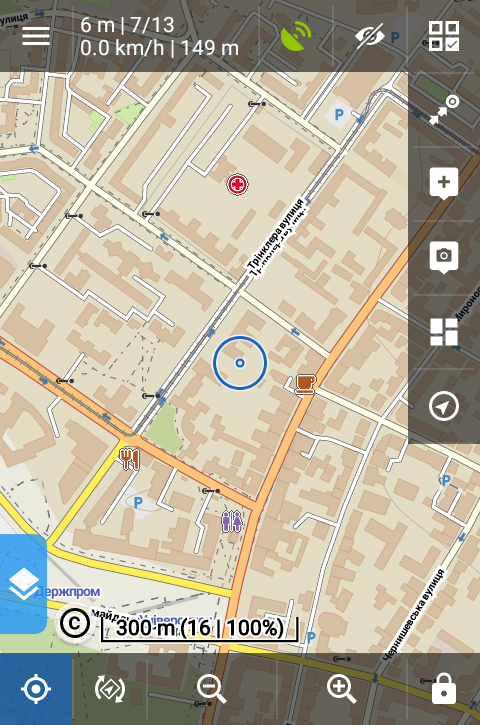 Теперь всё готово для того, чтобы начать пользоваться программой. Включаем её, ждём, когда смартфон поймает спутники, и наблюдаем своё местоположение на карте. Также можем загрузить маршрут, включить запись трека, включить ведение к какой-либо точке, или выполнить ряд других полезных операций.
