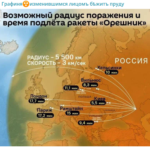 В Сети уже появилась карта, на которой показано, до каких городов может долететь «Орешник», если его запустить с полигона «Капустин Яр», расположенном в юго-западной части России. На ней отмечено восемь потенциальных целей с указанием времени подлёта ракеты.