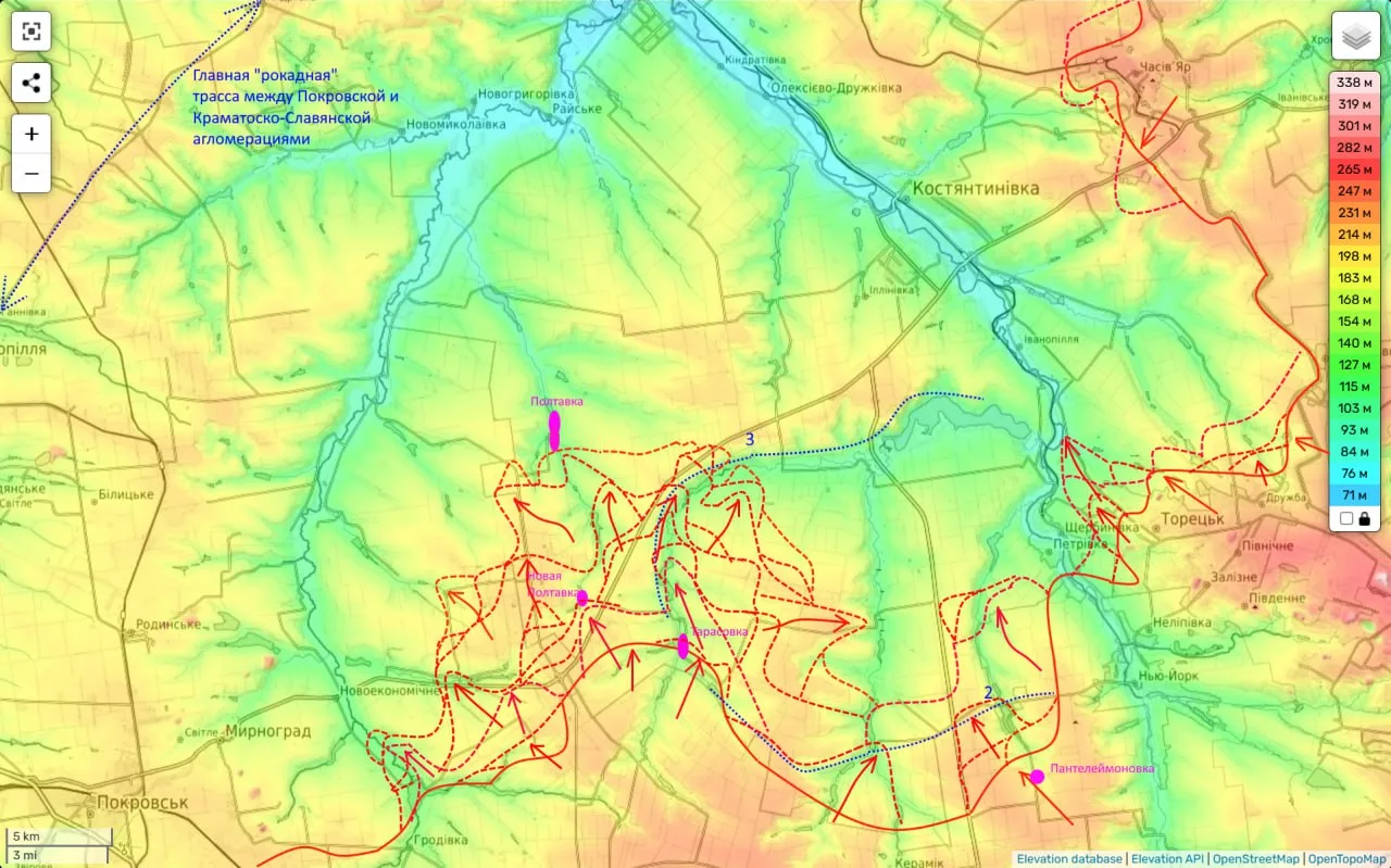 Таким образом, можно говорить о начале формирования охвата этого населенного пункта с трех направлений: северо-восточного (от Богатыря), восточного (от Отрадного) и южного (вдоль реки Мокрые Ялы). Активная контрбатарейная борьба, активное и массовое применение FPV-дронов и динамичное маневрирование штурмовых групп приводят к истощению противника и освобождению нашими войсками населенных пунктов.