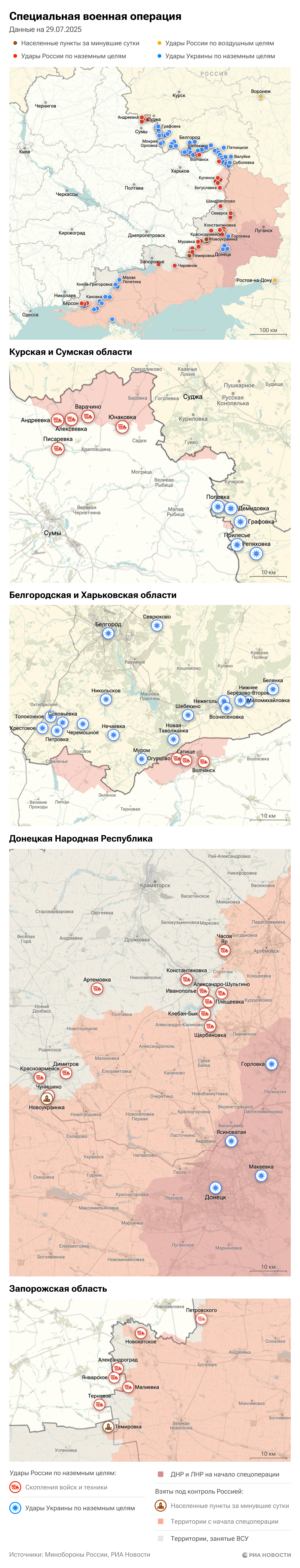 Российская ПВО ночью уничтожила по 3 вражеских БПЛА над Тульской и Брянской обл. и 2 над Курской обл., также ночью фиксировалась работа нашей ПВО над Донецком. В Белгороде беспилотник ВСУ атаковал многоквартирный дом, в результате детонации повреждено остекление порядка 10 квартир и фасад. Осколками посечены 24 автомобиля, пострадавших нет. Из пригорода Курчатова Курской обл., где расположена Курская АЭС, жители сообщали о работе ПВО. Местные утверждают, что дроны летели на малой высоте. В Сальске Ростовской обл., где вчера была атакована ж/д станция, восстановлено движение поездов. Уточнены потери от вчерашнего налета: погибло 3 человека, повреждения получили 10 многоквартирных домов и 11 частных домовладений. Вчера днем: в Белгородской обл. атакам БПЛА подверглись 10 городов и деревень, ранены 11 человек. Пострадали более десятка домов и техника. БПЛА атакуют работающую в полях сельхозтехнику. За июль только в Белгородской обл ранено 139 человек, из них — 12 детей. В Курской обл. тоже атакован трактор, а также погиб 19-летний сотрудник компании связи «Алабуга». В ДНР погиб мирный житель и еще один ранен.