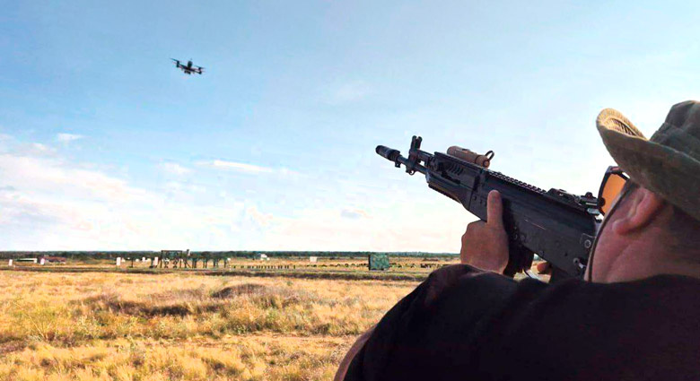 Стрельба по дрону из автомата. Где-то активные методы защиты от дронов срабатывают, но лучше быть и облачёнными в СИБЗ, на случай, если сбить «птичку» не получится... (фото из открытых источников).