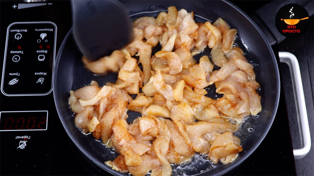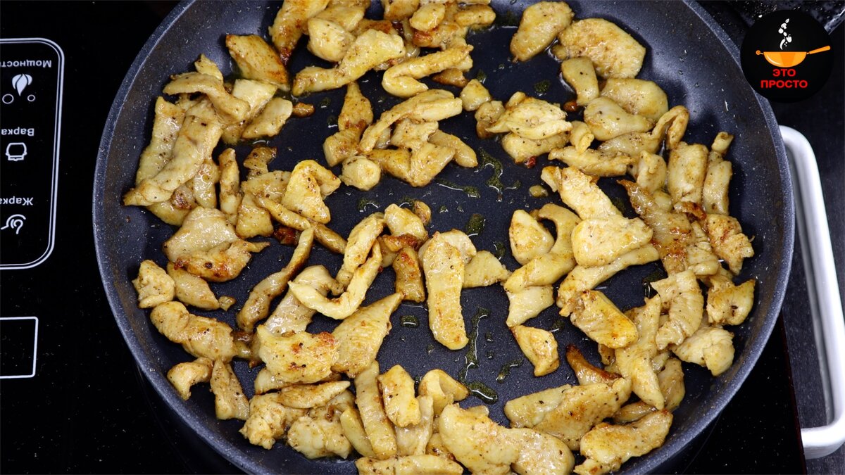 Тем временем, курица замариновалась. Общей сложностью она стояла в специях 15 минут. Теперь мы её выкладываем в разогретое растительное масло и обжариваем до золотистого цвета. Не забываем периодически мясо помешивать. По желанию к курице можно добавить чёрный молотый перец.