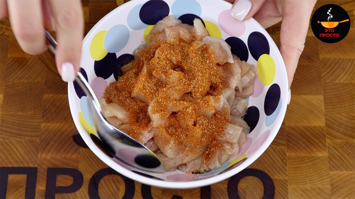Филе нарезаем на небольшие кусочки и перекладываем в тарелку. К курице добавляем приправу для гриля и шашлыка. Перемешиваем и оставляем мариноваться, пока нарезаем другие ингредиенты. В маринад можно класть любые специи, которые вам нравятся. Но из всех пряностей и приправ, мне нравится ещё карри.