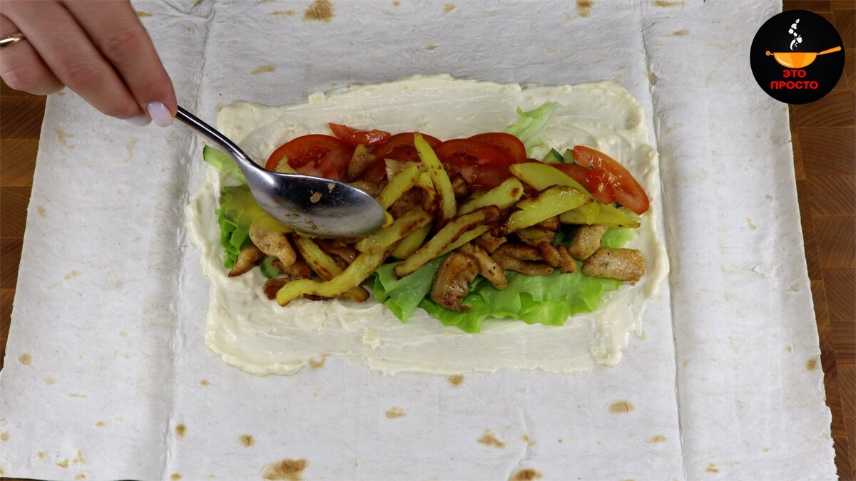 Наконец приступаем к сборке шавермы. Берём тонкий лаваш, он должен быть мягким и свежим, и выкладываем его на стол. Поверхность лаваша смазываем белым соусом, при этом отступая от краёв, определённое расстояние. Далее кладём листья салата и свежие овощи. На помидоры и огурцы кладём обжаренное мясо, затем – картофель фри.