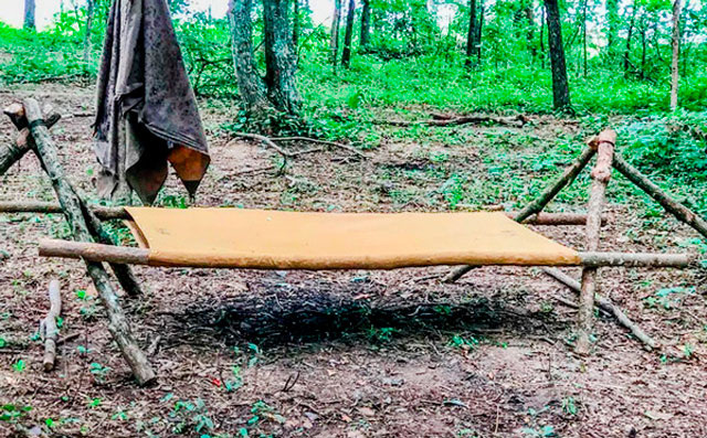 Лежанка на пирамидальных опорах, один из вариантов приподняться от грунта и лесной подстилки, повыше от холодной земли и муравьёв... (фото из открытых источников).