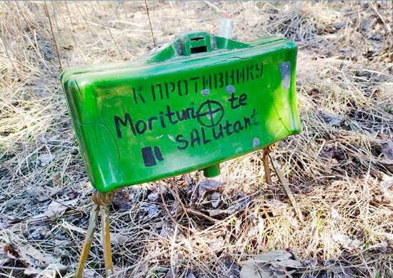 МОНка противника из управляемых минных полей, Марьинка. Донбасс, 2022. Хуторские «арийцы» по латыни написали: «идущие на смерть приветствуют тебя». При чём здесь девиз гладиаторов? Кто Цезарь? Реально у типов каша в голове... Она, голова, по ходу, им не очень-то и нужна была... (фото из открытых источников).