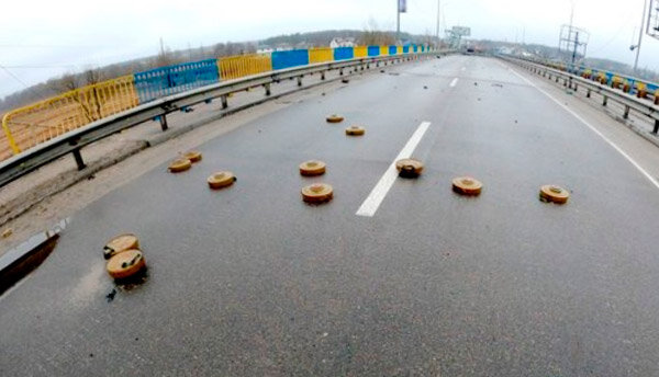 Асфальтированная дорога. На ней накиданы противотанковые мины. Никаких признаков долбления покрытия нет. Также нет намёков на шнуры, провода, связующие мины.