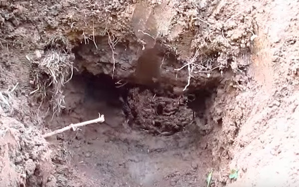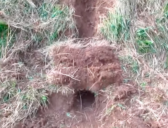 Сбоку от ямы, в сторону склона, роют траншею по склону вниз. В этой точке прокапывают соединение, чтобы дым из будущего дымохода попадал в камеру коптильни.