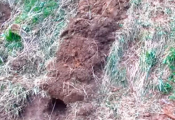Если подходящего дёрна нет, перекрыть траншею можно густым раствором глины. Опять же, армировать поперечными ветками.