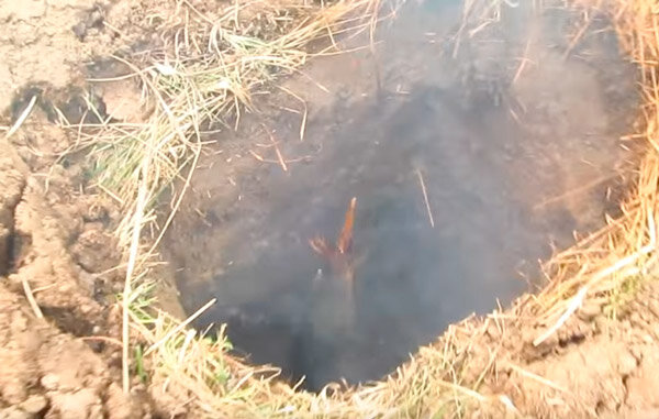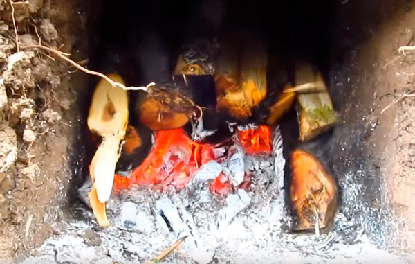 Начинают жечь в топке небольшой костёр из мелких сухих веток. Смотрят, где выходит дым. Закладывают дополнительно дёрном, подмазывают глиной.