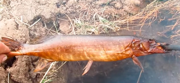 Готовая закопчённая щука на ветке-рогульке.