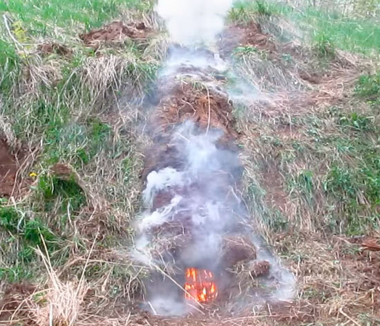 Перекрытие дёрном траншеи-дымохода сверху.