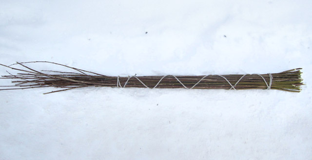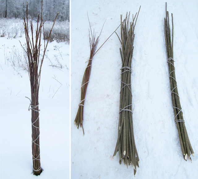 Ивовая лоза. Зимняя заготовка. Справа: пучок тонких прутиков для заплетания поверхностей. Слева: прутики разной толщины,. для плетения, для стоек, для обручей и ручек корзин