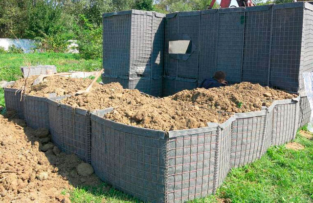 Изготавливают корзину с круглым или прямоугольным сечением. Наполняют камнями, грунтом, глиной и т.п. Проливают водой, утрамбовывают, дальше заполняют до верха. Такие конструкции защищают от пуль и осколков.