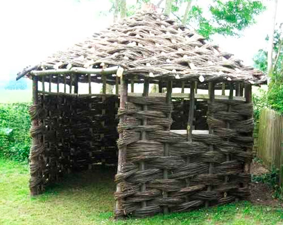 Можно даже строить целые дома, с использованием технологии плетения. Например, между двумя плетёными щитами, закреплёнными на крепких кольях в грунте, засыпать камень средней фракции, заливать вязкой глиной, утрамбовывать. Снаружи можно дополнить слоем сухого камыша, тростника, чтобы дождь не попадал на такие стены. В некоторых условиях, при удачном рельефе местности, даже это избыточная мера, и можно просто плетёные снаружи стены и оставить.