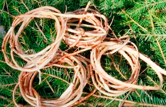 Корень хвойных деревьев – также материал без такой жёсткой сезонной привязки, как лоза ивы и липовое лыко.