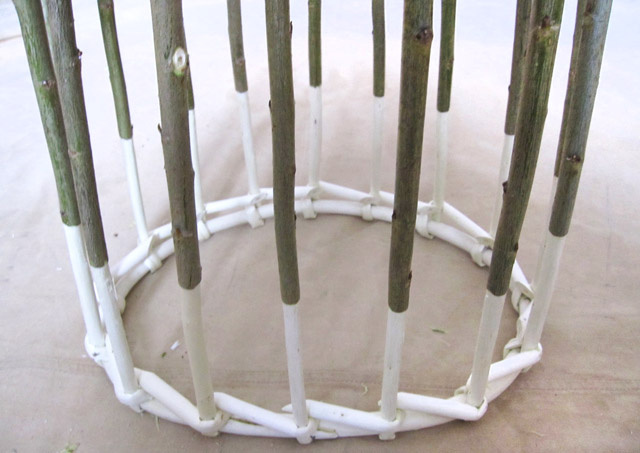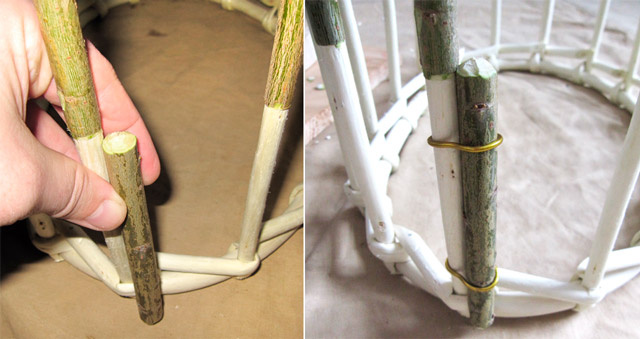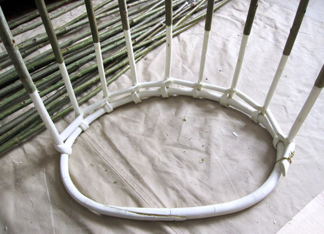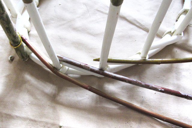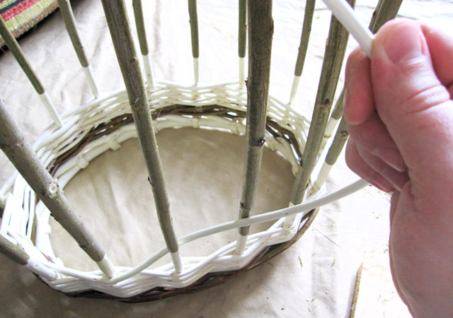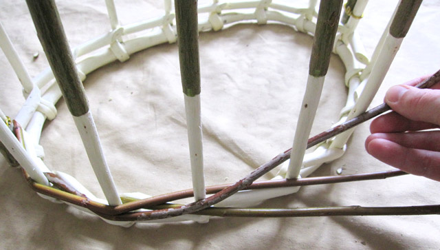 Процесс плетения корзины из ивовой лозы от обруча.