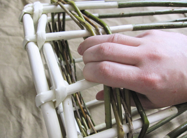 03. Как сплести первую корзину. установка основ, верёвочка в 3 прута по низу.