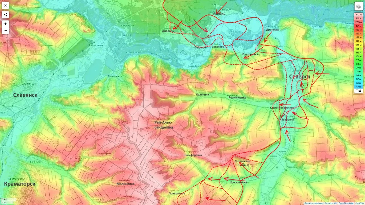 Только его надежда на то, что ВС РФ не форсируют Бахмутку в городе, это что-то вроде последней соломинки. Дело в том, что западнее города — в районе Платоновки — российские войска уже вышли на правый берег этой реки и продвигаются в направлении северской улицы Дачная, переходящей в дорогу на Красный Лиман. Контролируют ВС РФ территории на западном берегу Бахмутки и в районе Свято-Покровского.