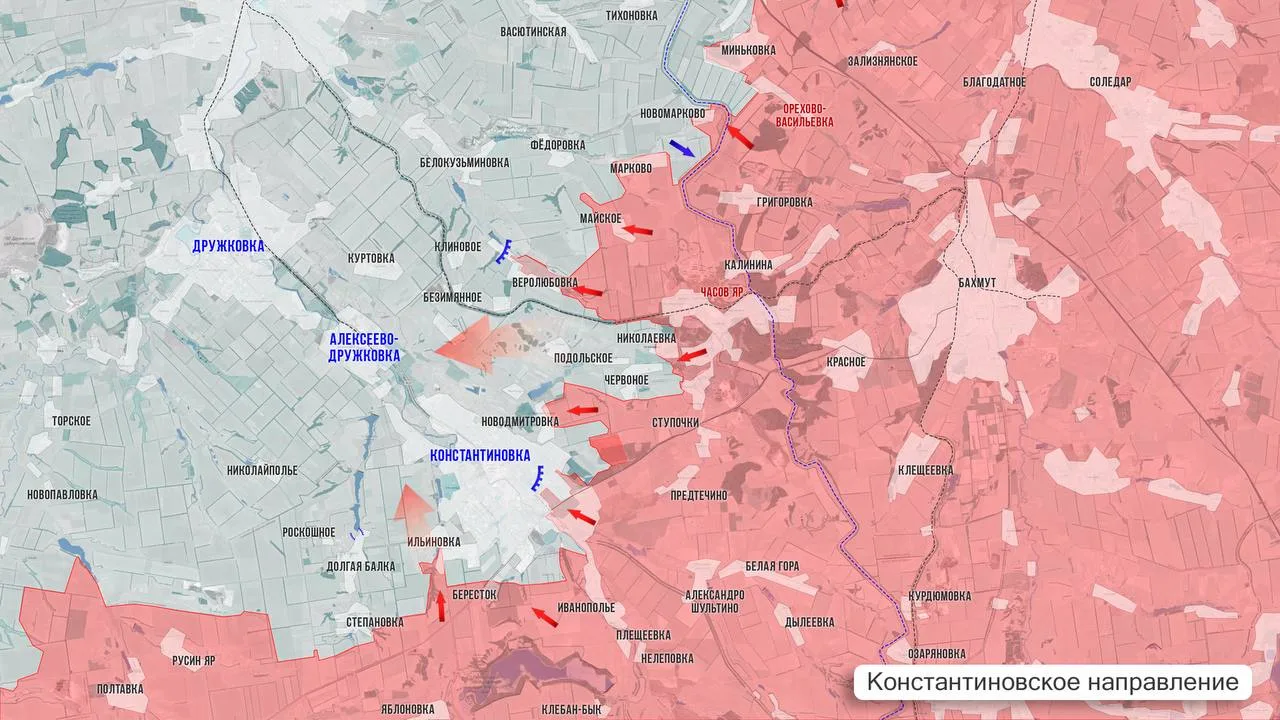 Константиновское направление. На Константиновском направлении российские войска стараются расширить зону контроля в районе Ильиновки и севернее Степановки.