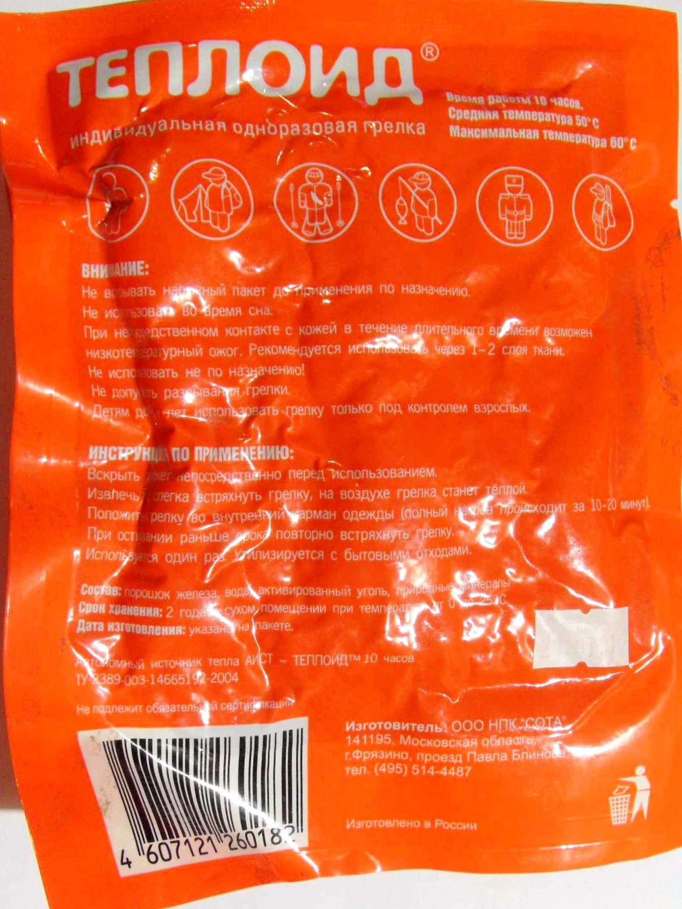 Химическая одноразовая грелка «Теплоид». Выглядит несерьёзно — лёгкий пакетик весом семьдесят граммов. Размер двенадцать на тринадцать сантиметров, толщина всего пара сантиметров. Стоит копейки. Лежит в кармане месяцами без потери свойств. Ждёт своего часа.